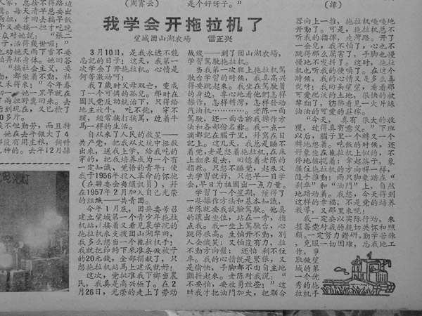 1958年3月16日雷锋在《望城报》上发表文章《我学会开拖拉机了》