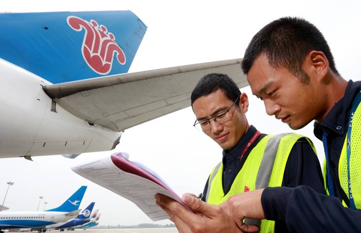 河南省郑州市新郑国际机场停机坪上,安全工程师为飞机进行“全身体检”。每次安全出航,都凝聚着航天人敬业、精益、专注、创新的“工匠精神”。