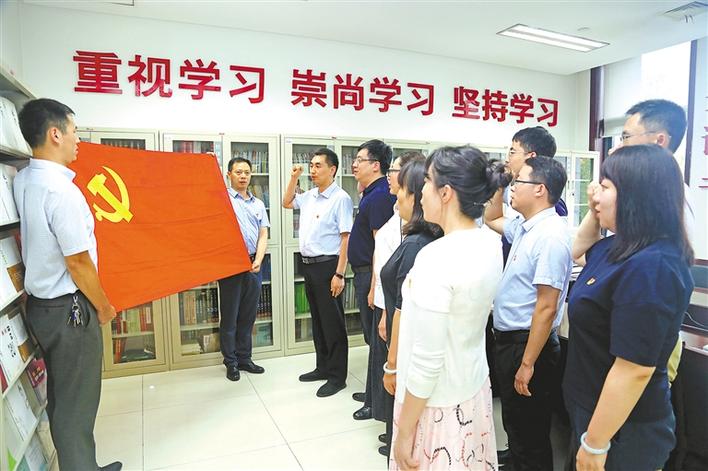 6月28日,省纪委监委组织部党支部开展“学习英雄,初心永恒”主题党日活动,支部书记黄戈带领支部党员重温入党誓词。 记者 董渺摄