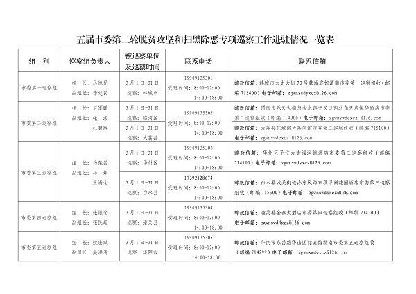 按照市委统一部署,市委成立五个巡察组采取“一拖二”的方式,从3月1日开始至3月31日压茬对韩城市、华州区、华阴市、潼关县、大荔县5个县(市、区)开展脱贫攻坚和扫黑除恶专项巡察工作,对临渭区、白水县2个县(区)开展扫黑除恶专项巡察工作。