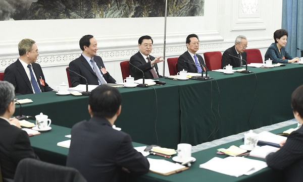 3月10日,中共中央政治局常委、全国人大常委会委员长张德江参加十二届全国人大五次会议宁夏代表团的审议。新华社记者 高洁 摄