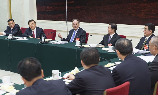 3月10日,中共中央政治局常委、中央纪委书记王岐山参加十二届全国人大五次会议甘肃代表团的审议。新华社记者 崔新钰 摄