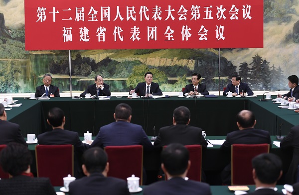 3月10日,中共中央政治局常委、国务院副总理张高丽参加十二届全国人大五次会议福建代表团的审议。新华社记者 燕雁 摄