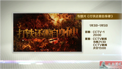 由中央纪委宣传部、中央电视台联合制作的电视专题片《打铁还需自身硬》将于1月3日到5日在中央电视台综合频道每晚8点首播,新闻频道每晚9:30重播。
